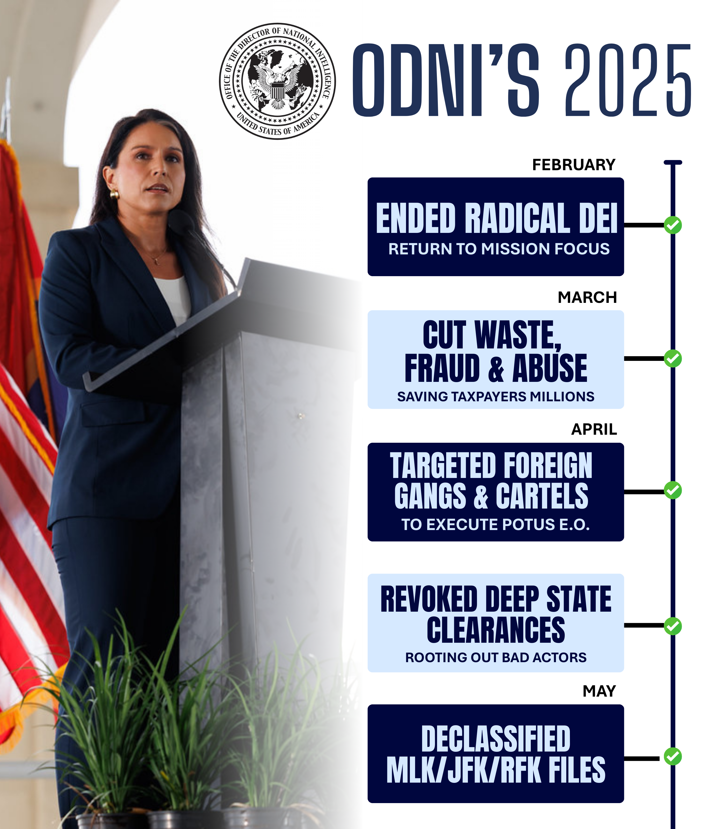 DNI Gabbard unveiled ODNI 2.0, a historic transformation to rebuild an elite and efficient workforce, end the weaponization of intelligence, and refocus on the core mission of intelligence integration and oversight.