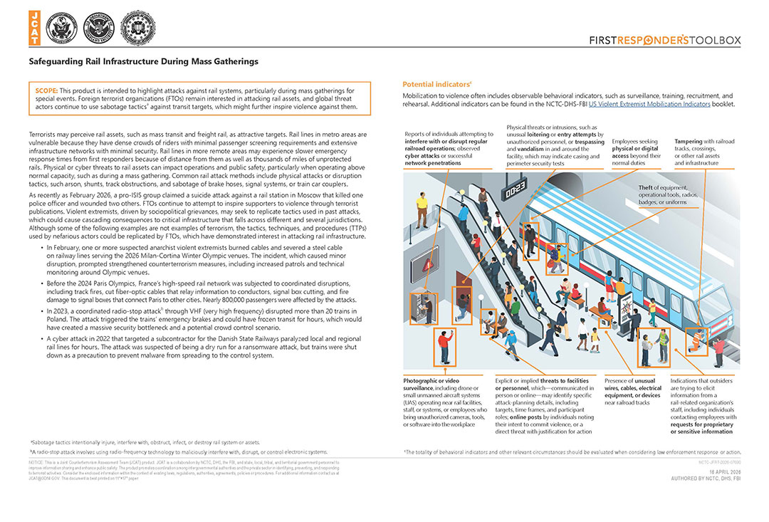 This product provides considerations for public safety, rail, and mass transit officials in planning for potential threats or attacks against rail assets during mass gatherings for special events.