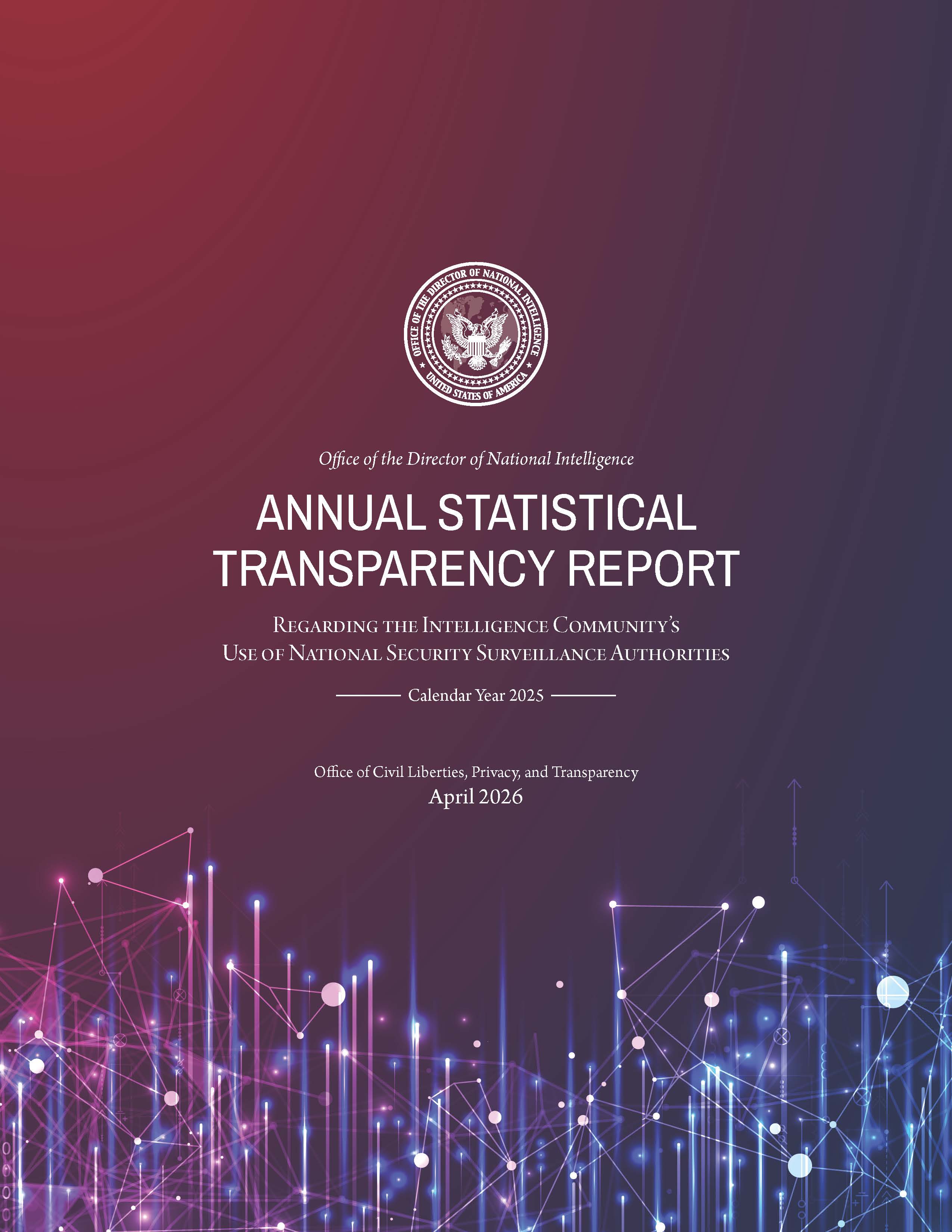WASHINGTON, D.C. – The Office of the Director of National Intelligence (ODNI) today released the Annual Statistical Transparency Report (ASTR) Regarding the Intelligence Community’s (IC) Use of National Security Surveillance Authorities for Calendar Year 2025. The ASTR combines statistics with contextual information to share with the American people on the IC’s use of Foreign Intelligence Surveillance Act (FISA) authorities, National Security Letters, and other national security authorities. The report also provides insights into how these authorities are overseen to ensure privacy and protect the civil liberties of persons whose information is acquired as a part of the IC’s national security work.